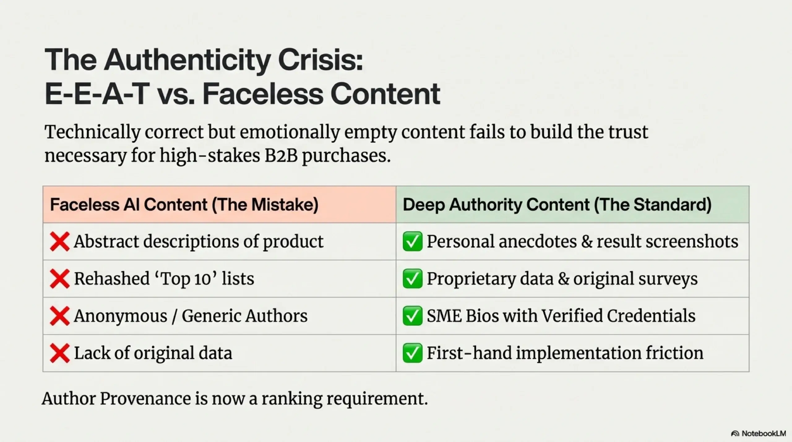 To satisfy E-E-A-T signals, B2B firms must feature recognized experts with detailed bios that highlight certifications, education, and practical experience. Furthermore, the lack of transparency regarding AI use and the absence of original research are significant red flags for both search engines and skeptical technical buyers.