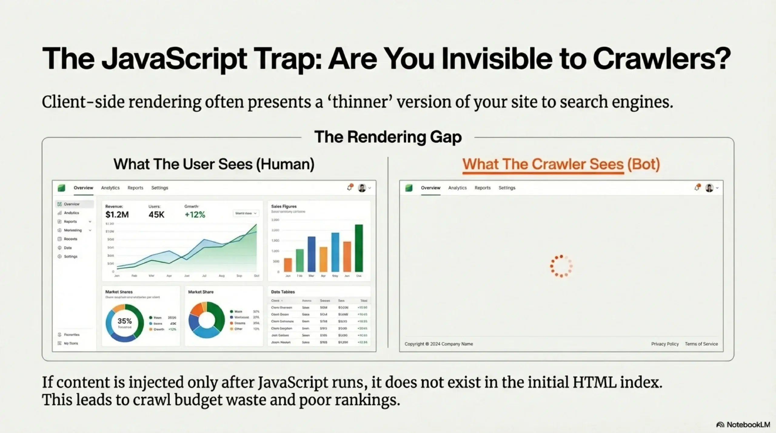 The increased use of complex JavaScript frameworks in B2B SaaS websites has created significant barriers to indexing. A common mistake is relying on client-side rendering without ensuring that search crawlers can see the “full” version of the page. If key content or critical internal links are only injected after JavaScript runs, crawlers may see a “thinner” version of the site than human users do, leading to poor rankings.