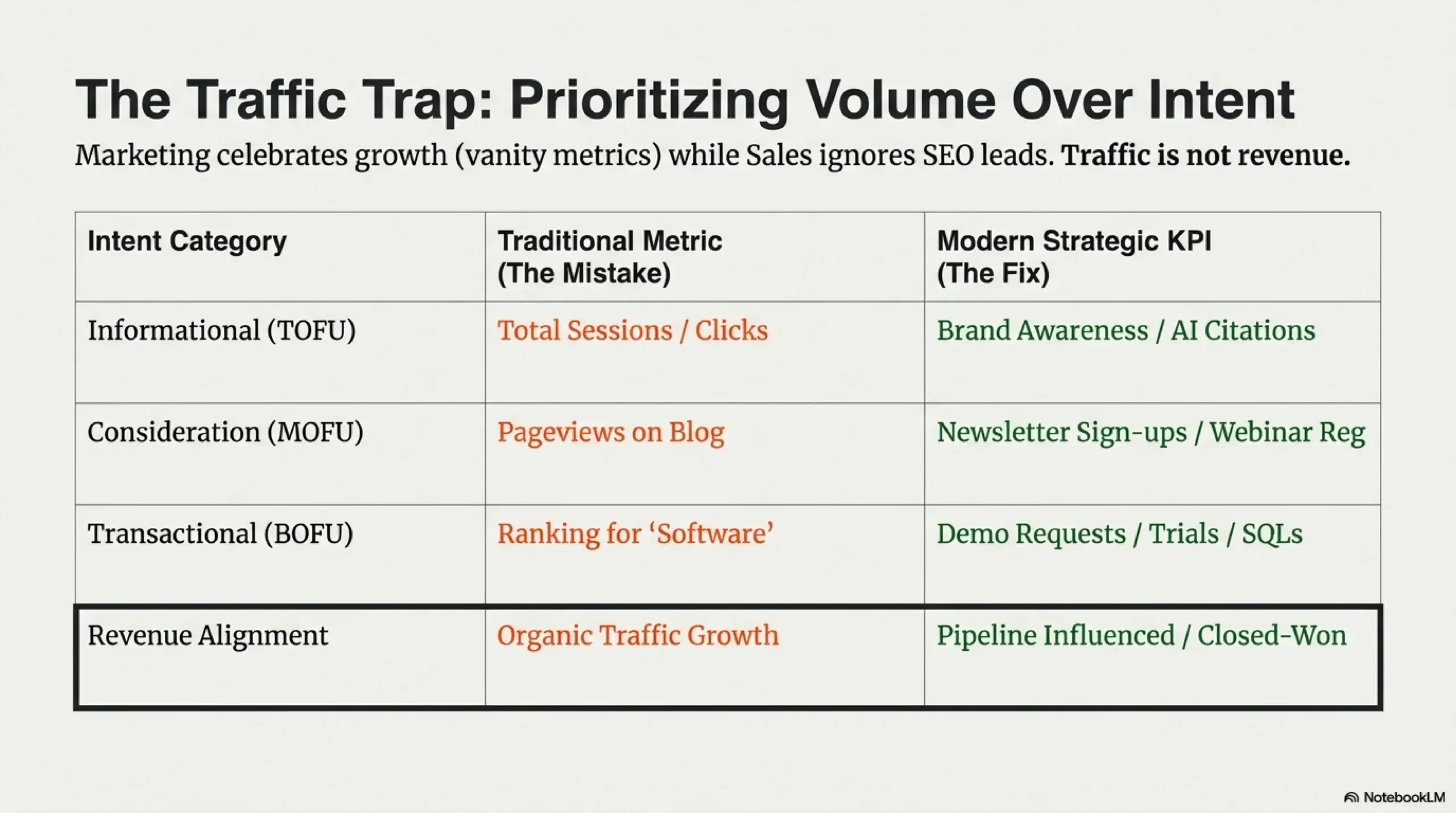 | Intent Category | Traditional Metric (Mistake) | Modern Strategic KPI (Correct) |