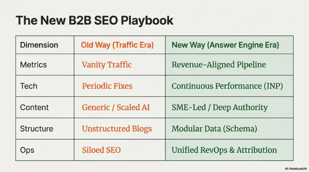 The aggregate of these mistakes intends misalignment, technical debt, E-E-A-T erosion, and attribution failures paints a picture of an industry at a crossroads. For B2B technical companies, the primary mistake is the failure to recognize that search is no longer a tactical marketing channel but a core component of the business’s revenue infrastructure.