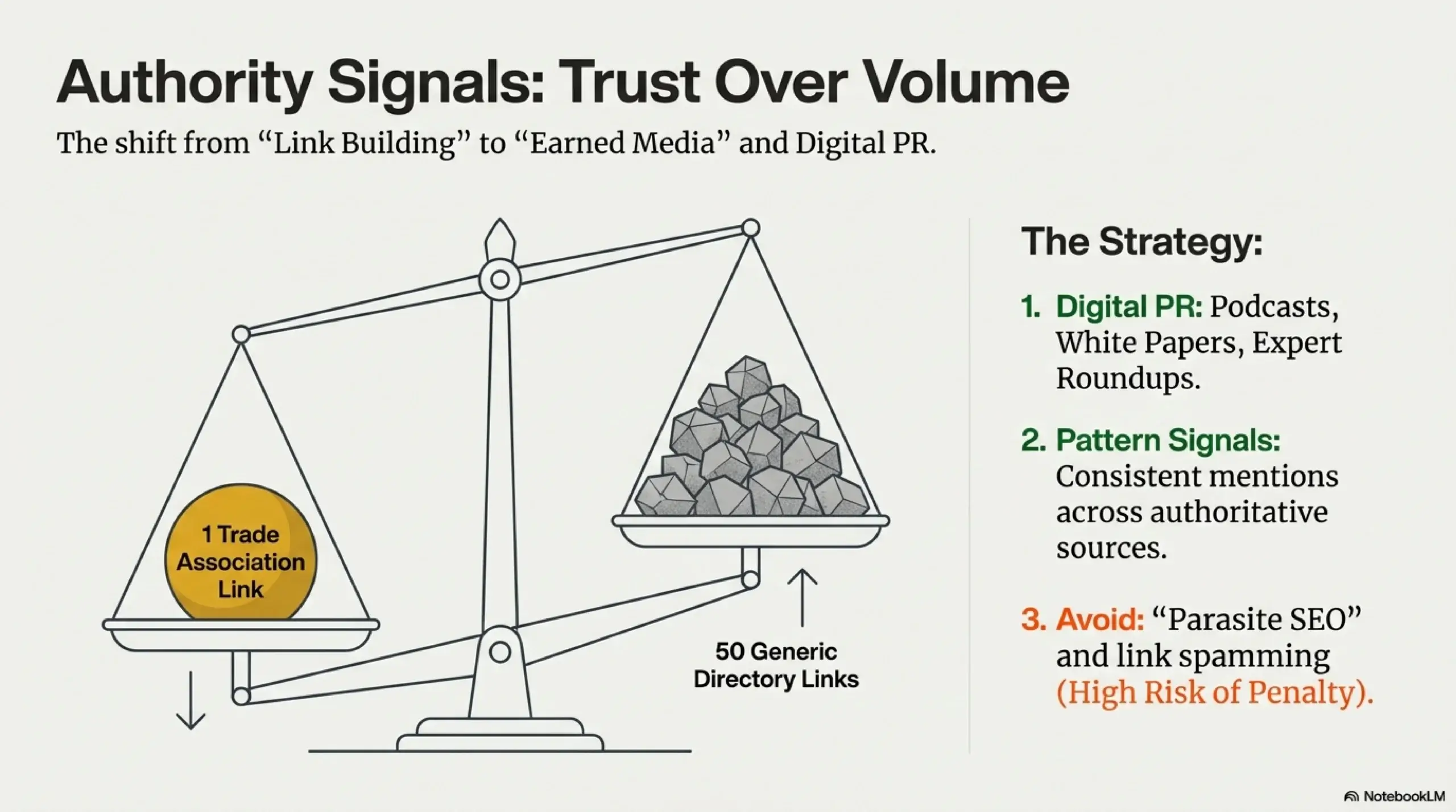 As competition intensifies, some B2B firms have turned to “risky shortcuts” or “parasite SEO” (leveraging the authority of high-traffic third-party sites through questionable partnerships). These tactics are increasingly detected and neutralized by search algorithms, leading to sudden and often permanent ranking drops. A sustainable strategy prioritizes defensible authority built on original data and genuine expert consensus.